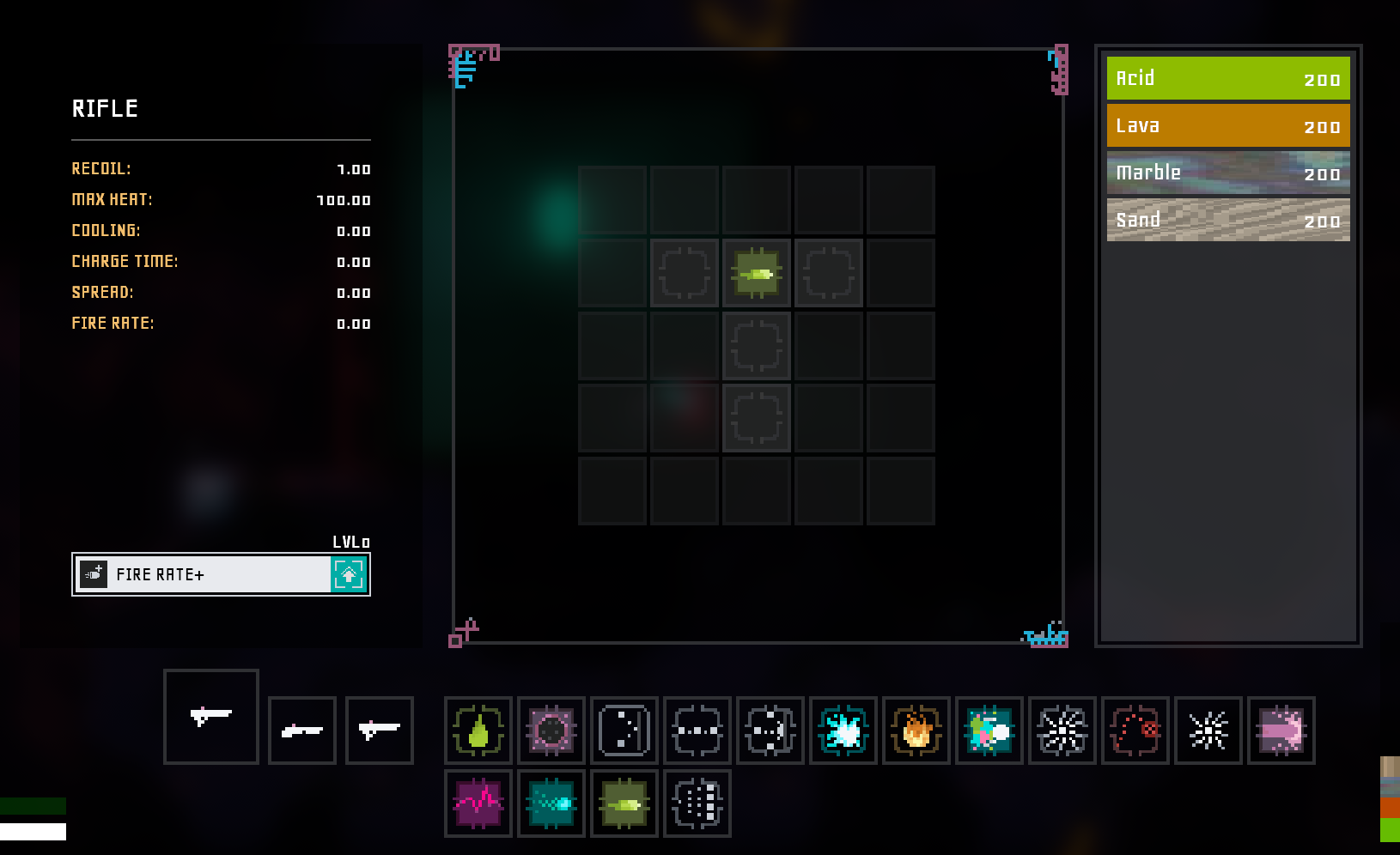 Another way to use material is for upgrading weapons. A weapon may have 0, 1 or 2 upgrade properties which can be leveled up with varying amounts of material. For example, the requirement to raise the Fire Rate upgrade’s level to 2 could be 50 Lava and 30 Sand.